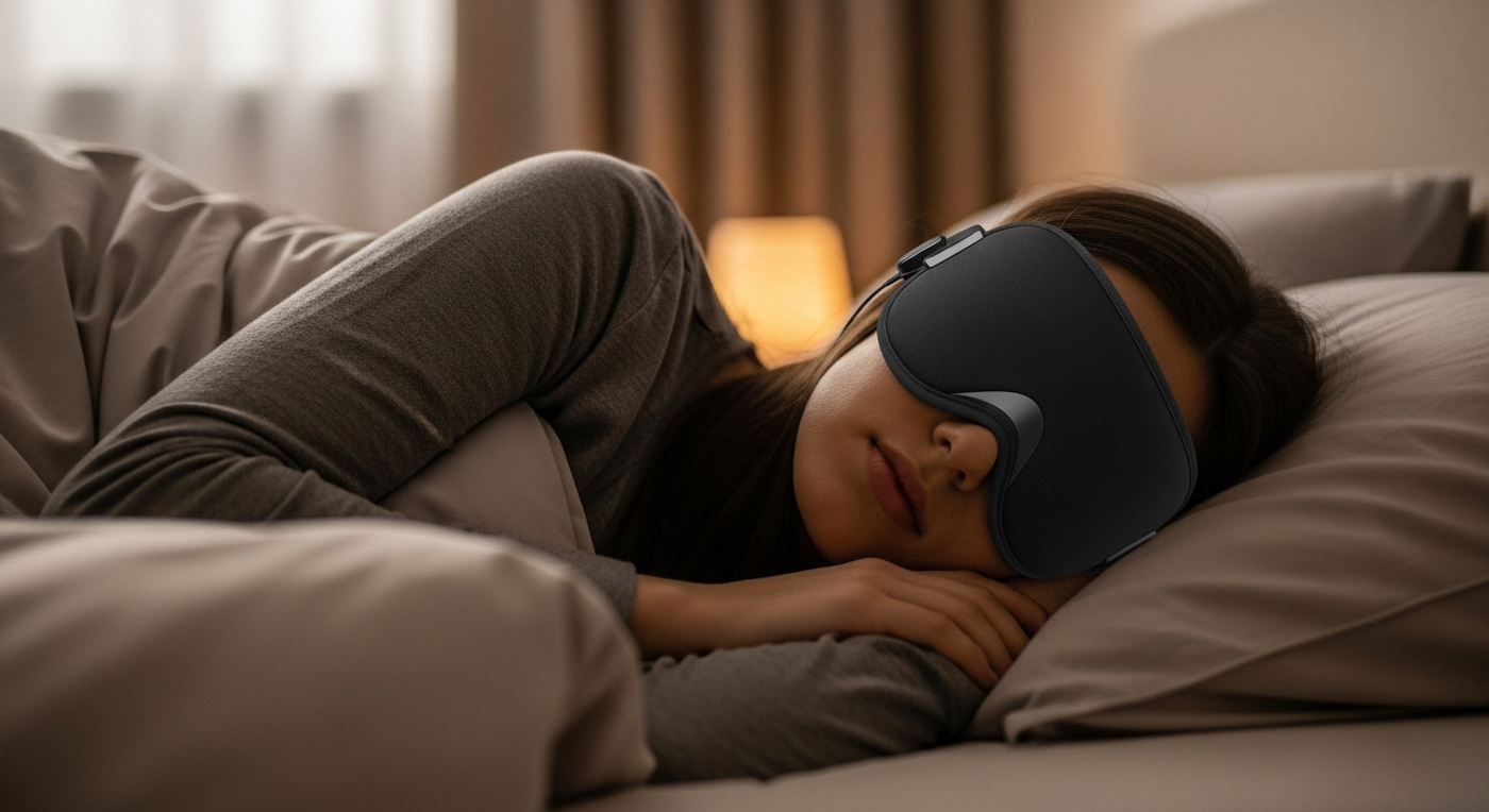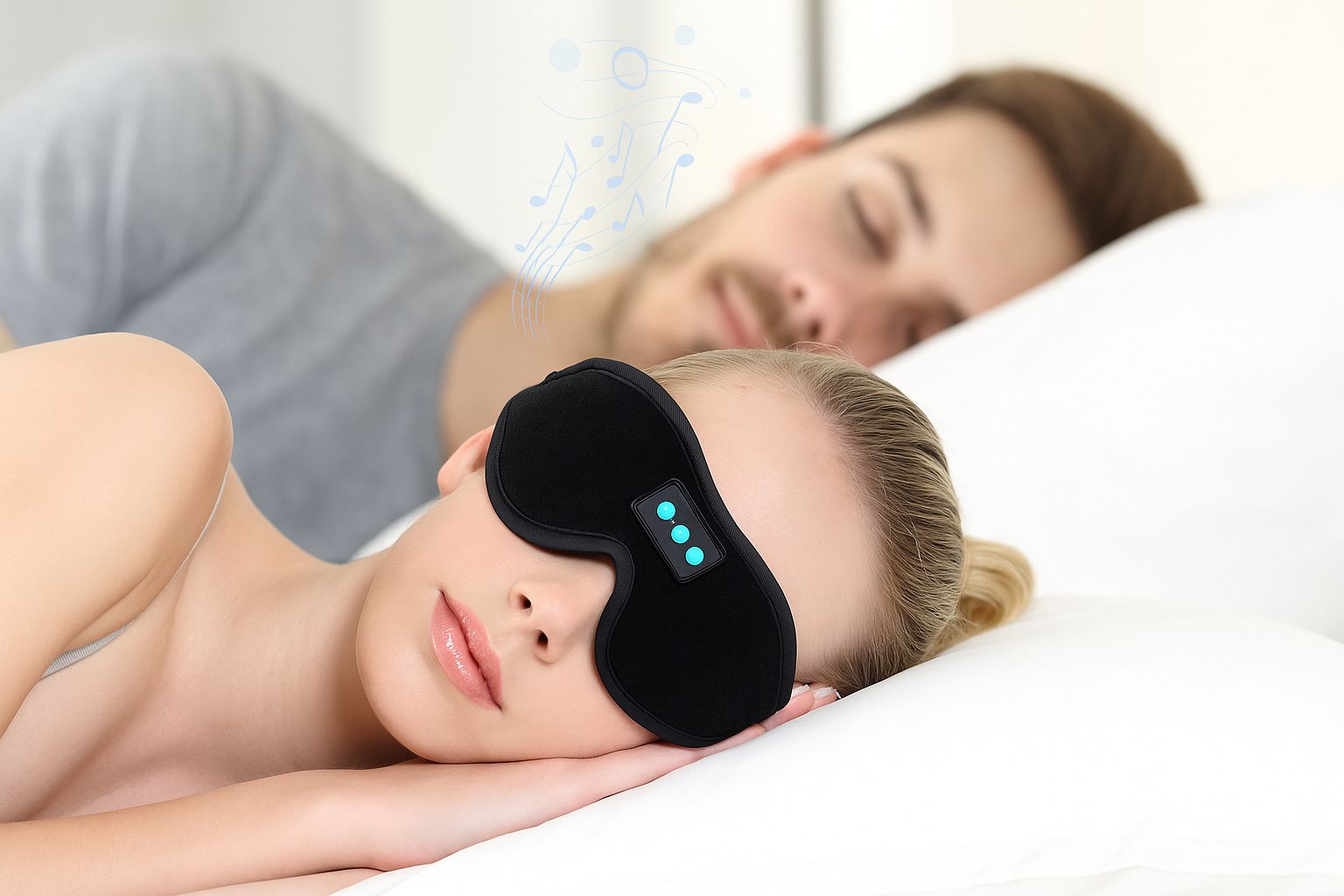 Un masque 3 en 1 combinant casque Bluetooth, masque de sommeil et bandeau.